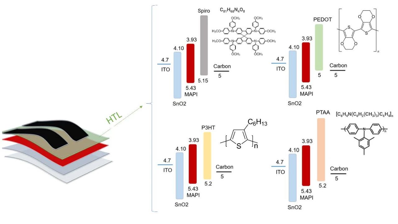 展示了采用多種空穴傳輸候選材料(包括spio - meotad、PTAA、P3HT和PEDOT)的平面NIP 堆疊[氧化錫(SnO2)/鈣鈦礦(MAPI)/HTL/碳]鈣鈦礦太陽能電池的設計