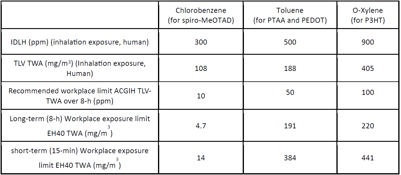在深入研究了涂布有2-甲基苯胺基碳涂層的螺旋和PTAA的空穴傳輸材料的缺點和兼容性挑戰(zhàn)之后,我們的研究重點轉移到了另一種待定的空穴運輸材料上。P3HT,這種材料不溶于2-甲基苯胺。P3HT因其在PSCs中作為導電、穩(wěn)定和經濟的空穴傳輸材料而獲得了廣泛的認可。值得注意的是,P3HT在高毒性溶劑氯苯和氯仿中表現(xiàn)出高溶解度,這兩種溶劑都因其潛在的健康危害而設有工作場所暴露限值。由于氯苯的工作場所暴露限值(WEL)很低,它的使用會受到一定限制, ACGIH設定的8小時時間加權平均(TWA)限值為10ppm。氯仿也有相同的ACGIH 8-h TWA限制為10ppm,這使得兩者都不適用于大面積的涂層系統(tǒng)。因此,它的應用僅限于小體積的產品,以確保符合安全使用限制。且處理大量氯苯將需要執(zhí)行嚴格和昂貴的遏制和監(jiān)測措施,在考慮大規(guī)模使用這種溶劑時,其所產生的環(huán)境影響將引起額外的關注。因此,需要使用低毒性的溶劑來取代氯苯并完全溶解P3HT。