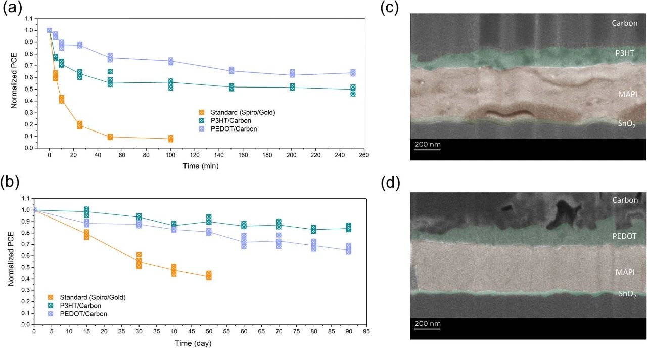 當在D3條件下(65°C和85% RH)進行測試時,與使用P3HT的設備相比,含有PEDOT的設備具有較好的穩(wěn)定性。250分鐘后,PEDOT保留了初始功率轉換效率的70%,而P3HT保留了60%。與傳統(tǒng)的螺旋/金電極器件相比,PEDOT/碳電極器件和P3HT/碳電極器件都具有較好的濕度和溫度穩(wěn)定性。D1穩(wěn)定性測量結果表明,用P3HT涂層的器件表現(xiàn)出優(yōu)異的長期穩(wěn)定性,在90天后保持其初始功率轉換效率的85%以上。使用PEDOT的設備也表現(xiàn)出相當大的穩(wěn)定性,保持其初始功率轉換效率的75%以上。這種高穩(wěn)定性歸因于PEDOT、P3HT和碳的固有疏水性,形成了一種屏障,有效地阻止水分滲入鈣鈦礦層,從而使其具有高降解。