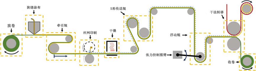 R2R系統(tǒng)以柔性基材(卷材)為核心,從放卷裝置開始,依次經(jīng)過狹縫式涂布器、絲網(wǎng)印刷機(jī)、加熱干燥裝置,最終通過干法轉(zhuǎn)移將印刷圖案轉(zhuǎn)移至目標(biāo)基材,如圖1所示。此過程中,牽引輥、S形傳送輥和浮動輥等累加器組件精確控制卷材的張力和速度,確保生產(chǎn)過程的穩(wěn)定性和連續(xù)性。