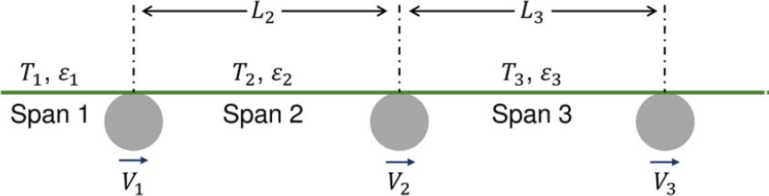 圖2 多跨段卷對卷(R2R)生產(chǎn)線中的應(yīng)變傳輸(Ti和εi分別表示第i個卷材跨段的卷材張力和應(yīng)變,Vi表示第i個跨段末端的卷材縱向速度,Li表示第i個跨段的長度,其中i=1–3)02