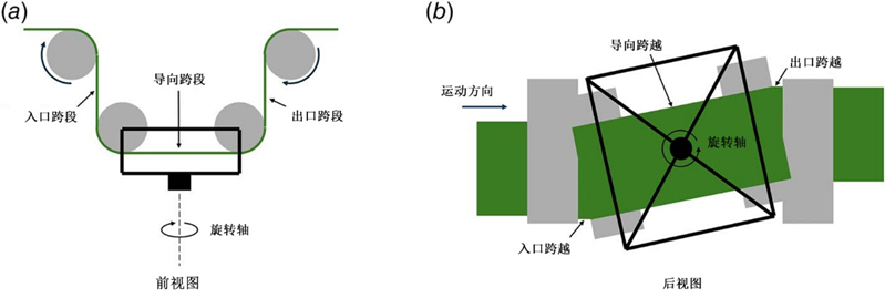 圖3 用于控制卷材橫向位置的位移導(dǎo)向裝置示意圖:(a)前視圖和(b) 底視圖