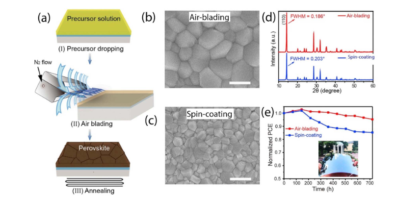圖 1(a)氣刀輔助法沉積鈣鈦礦薄膜的示意圖。(b)和(c)分別是用氣刀(b)和旋涂(c)法沉積的鈣鈦礦MAPbI3薄膜的俯視掃描電子顯微鏡(SEM)圖像,展示了晶粒結(jié)構(gòu)的差異。(d)MAPBI薄膜的 X 射線衍射(XRD)圖譜,突出了氣刀技術(shù)對(duì)結(jié)晶度的改善。(e)用每種方法制備的太陽能電池的穩(wěn)定性比較;插圖展示了一個(gè) 15 cm×15 cm 的鈣鈦礦模塊。
