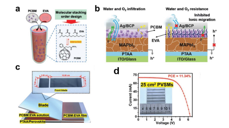 圖 2(a)添加乙烯 - 醋酸乙烯酯(EVA)添加劑后對(duì) PCBM(苯基 - C61 - 丁酸甲酯)分子堆積順序調(diào)控的示意圖。(b)使用 PCBM-EVA 電子傳輸層(ETL)的鈣鈦礦太陽能電池(PSC)示意圖,突出顯示了其改善的電荷轉(zhuǎn)移能力、增強(qiáng)的防水氧阻隔性能以及減少的離子遷移。(c)含有 EVA 添加劑的刮刀涂布 PCBM 緩沖層示意圖。(d)基于 PCBM 電子傳輸層且效率最佳的大面積鈣鈦礦太陽能電池模塊的電流密度 - 電壓(J-V)曲線。