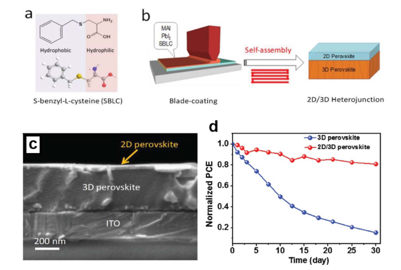 三、二維鈣鈦礦作為保護(hù)層人們還開發(fā)了一些策略來增強(qiáng)鈣鈦礦層的剛性,以提高其在露天條件下的耐久性。墨水工程在二維鈣鈦礦的發(fā)展中起著關(guān)鍵作用。在二維鈣鈦礦的開發(fā)中,對(duì)有機(jī)陽離子部分進(jìn)行結(jié)構(gòu)修飾至關(guān)重要。增加烷基銨鏈的長(zhǎng)度可使鈣鈦礦層更具疏水性。盡管這種疏水性增強(qiáng)了該層在露天條件下的穩(wěn)定性,但也帶來了電絕緣方面的挑戰(zhàn),限制了二維鈣鈦礦在完整器件構(gòu)建中的應(yīng)用。然而,使用二維鈣鈦礦作為體相鈣鈦礦上的保護(hù)層已被認(rèn)為是提高鈣鈦礦太陽能電池穩(wěn)定性和增強(qiáng)其將收集到的光轉(zhuǎn)化為電能效率的一種有前景的方法。研究表明,將二維鈣鈦礦與三維鈣鈦礦集成可以顯著提高太陽能電池的性能,利用兩種材料的優(yōu)勢(shì)來制造更穩(wěn)定、高效的器件。在 F. Guo 團(tuán)隊(duì)的一份報(bào)告中,使用刮刀涂布法制造了一種 2D/3D 鈣鈦礦太陽能電池,圖3a 和 b 示意性地展示了間隔分子 S - 芐基 - L - 半胱氨酸(SBLC)的結(jié)構(gòu)以及器件制造過程。圖 3c 提供了詳細(xì)的橫截面 SEM 圖像,展示了層的形成和結(jié)構(gòu)完整性。這項(xiàng)研究表明,在一步印刷過程中,在三維甲基碘化鉛()層上生長(zhǎng)了二維鈣鈦礦層,與沒有二維鈍化層的鈣鈦礦太陽能電池相比,器件性能得到了改善。盡管額外的二維鈣鈦礦具有固有的絕緣行為,可能會(huì)降低器件效率,但在這項(xiàng)工作中有效地解決了這一挑戰(zhàn)。通過三步電荷傳輸過程實(shí)現(xiàn)了性能的提升:首先,光生電荷載流子擴(kuò)散到 2D/3D 鈣鈦礦界面;其次,載流子向 PCBM 與 3D 鈣鈦礦直接接觸的區(qū)域進(jìn)行橫向擴(kuò)散;最后,由于 3D 鈣鈦礦薄膜僅部分被 2D 層覆蓋,仍有足夠的面積用于有效電荷提取。這種二維和三維鈣鈦礦的策略性集成最終提高了器件的整體效率和穩(wěn)定性(圖3d)。