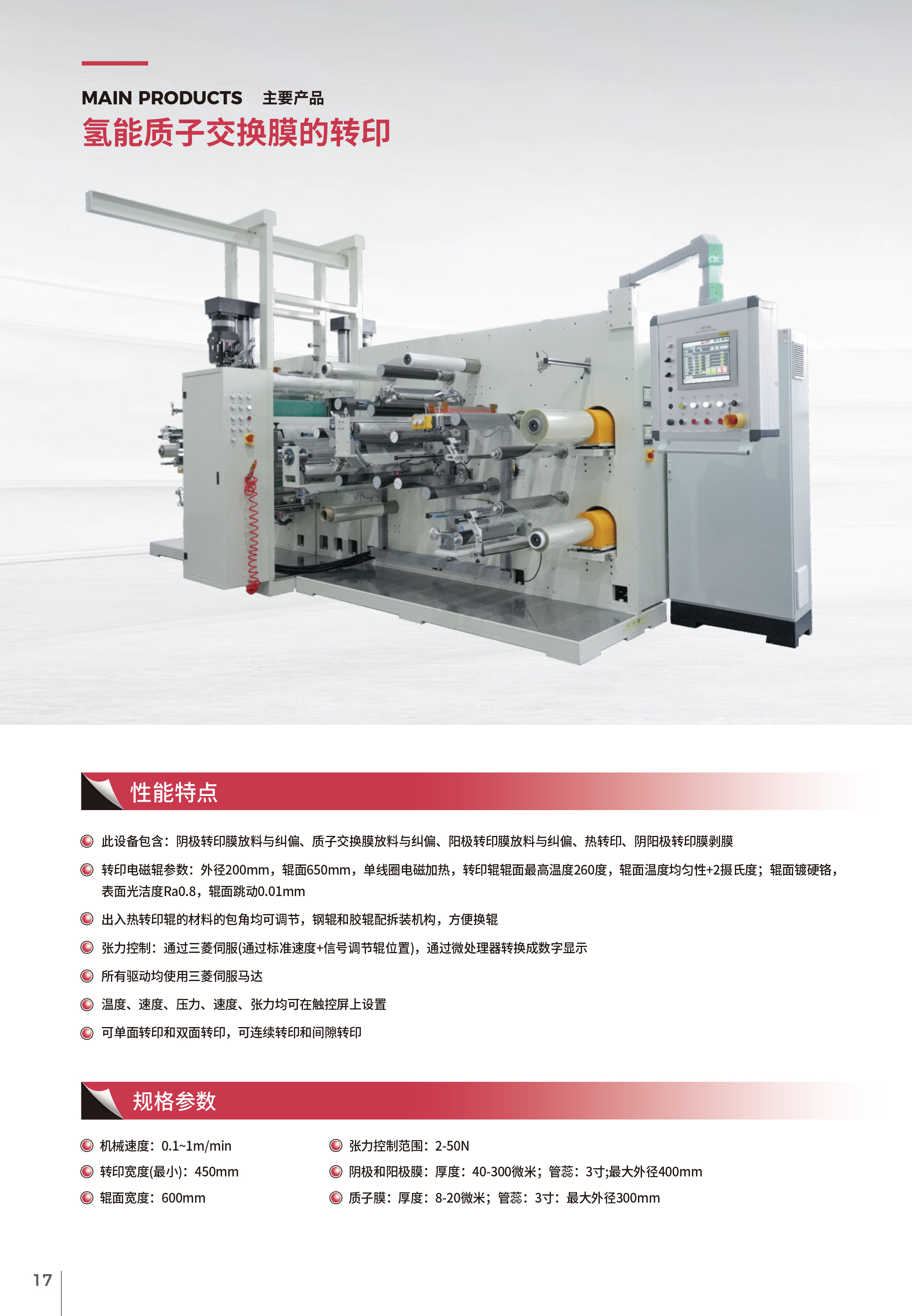 此設(shè)備包含:陰極轉(zhuǎn)印膜放料與糾偏、質(zhì)子交換膜放料與糾偏、陽極轉(zhuǎn)印膜放料與糾偏、熱轉(zhuǎn)印、陰陽極轉(zhuǎn)印膜剝膜